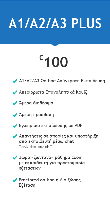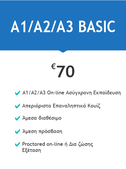 - Οn-line διαδικτυακή εξέταση Α1-Α3 και δια ζώσης ή on-line proctored εξέταση Α2, αφού ολοκληρώσετε την εκπαίδευση, σε χρόνο που σας εξυπηρετεί.